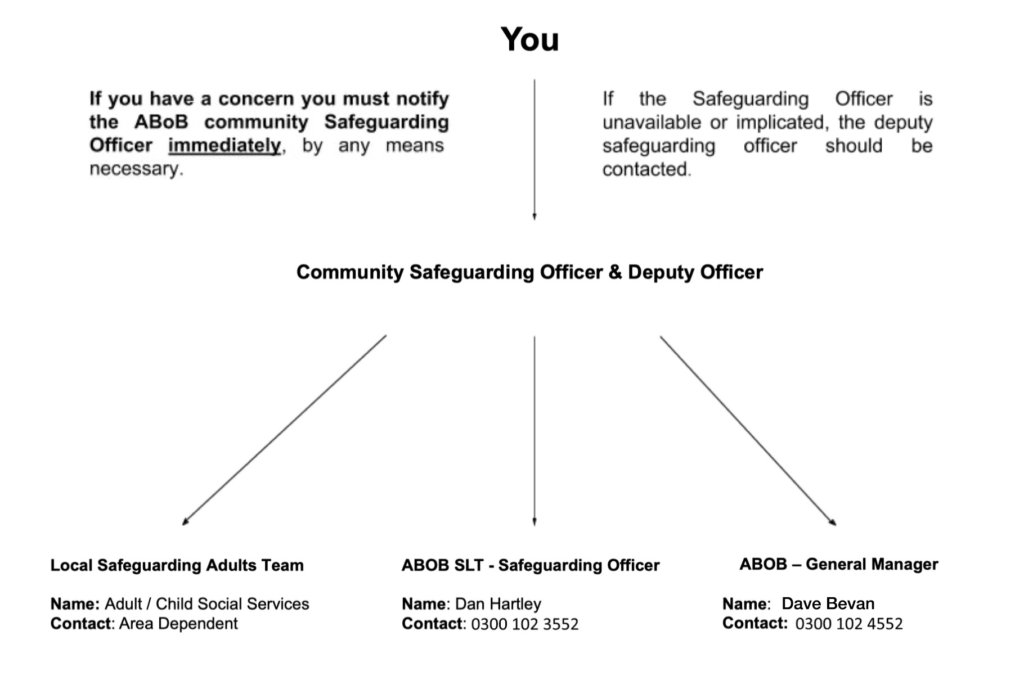 - If the concern is regarding the designated safeguarding officer himself then concerns or suspicions should be made to the deputy safeguarding officer and to the ABoB Hub Officer – thereby concerns and safeguarding alerts can be made through a parallel line of confidential communication to ABoB National Team.